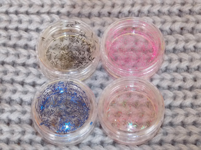 Na a glitterkék. Ami picit fura volt ezekben a glitterekben, hogy eltérő mennyiség volt egy-egy kis tégelyben, így a fentieket hamarabb el tudtam használni. A fekete és kék szálacskák jól bírták/bírják a kiképzést, a színük nem oldódott fel a lakkokban. A rózsaszín irizálóban viszont nem vagyok biztos, szerintem picit veszített a színéből. Amennyire meg tudtam állapítani a pink mini glitterek is bírják a strapát.